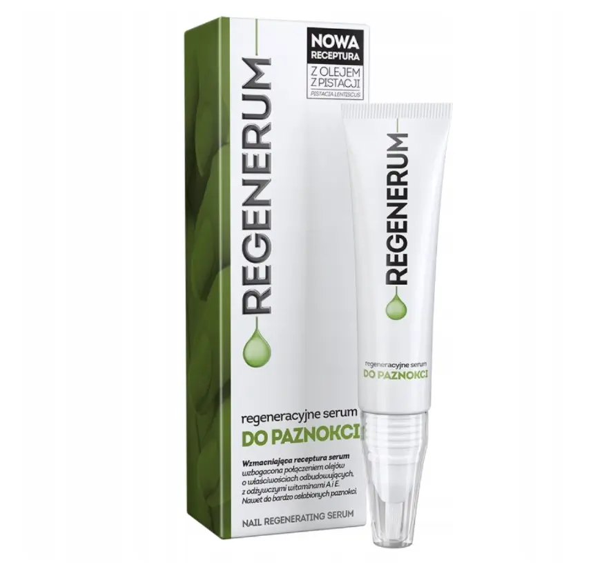 Regenerum - Regeneracyjne serum do paznokci to nowoczesny preparat przeznaczony do pielęgnacji paznokci oraz otaczającego ich naskórka. Produkt odznacza się starannie dobraną kompozycją składników aktywnych (olej z pestek winogron, olej z orzechów makadamia, olejek ze słodkich migdałów), które wzmacniają, nawilżają oraz skutecznie regenerują płytkę paznokci. Zawarte w preparacie olejki sprawiają, że nawet najbardziej kruche i słabe paznokcie stają się elastyczne i zdrowe.