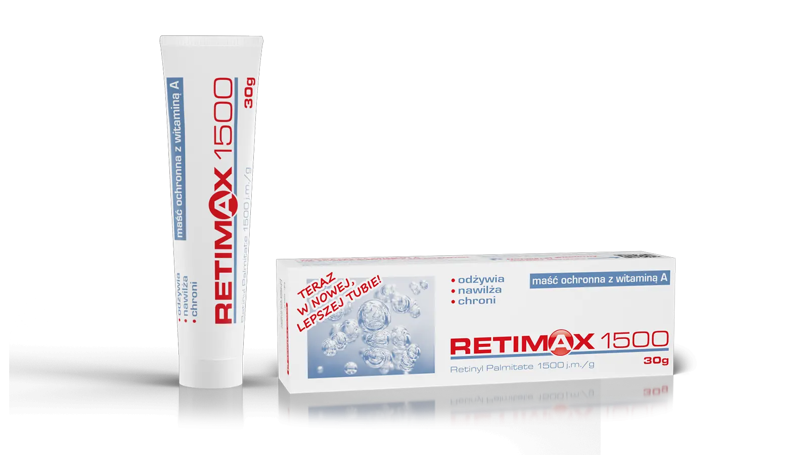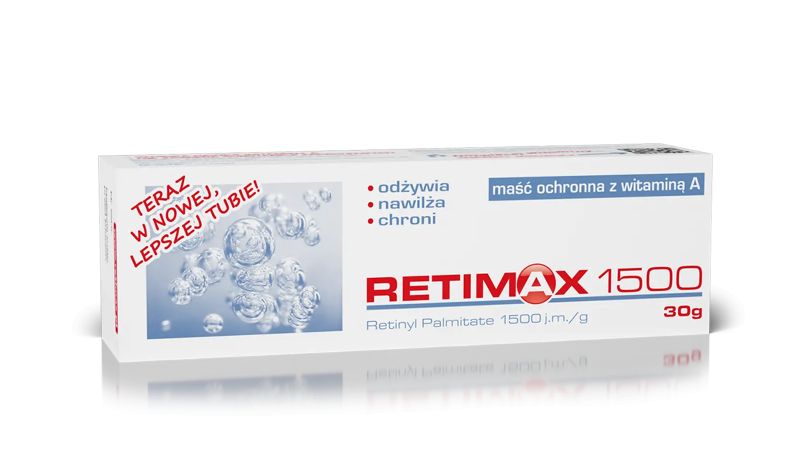 Retimax 1500 Maść z witaminą A 30g to wyjątkowy preparat ochronny do pielęgnacji skóry. Został stworzony, aby zadbać o skórę podrażnioną, przesuszoną oraz z tendencją do nadmiernego rogowacenia. Dzięki naturalnej witaminie A (retinolowi), który jest niezwykłym stymulatorem odnowy tkanek, ta maść przywraca skórze właściwe proporcje w budowie naskórka.