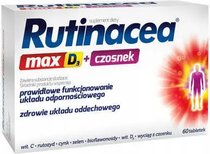 Suplement diety Rutinacea MAX D3 + czosnek zawiera: rutozyd, witaminy C i D, cynk, selen oraz wyciąg z owoców pomarańczy gorzkiej, w tym bioflawonoidy. Dodatkowo produkt wzbogacony został o wyciąg z czosnku. Selen, cynk oraz witaminy D i C pomagają w prawidłowym funkcjonowaniu układu odpornościowego. Ponadto witamina C przyczynia się do zmniejszenia uczucia zmęczenia i znużenia. Selen i cynk pomagają w ochronie komórek przed stresem oksydacyjnym. Obecna w składzie witamina D pomaga w utrzymaniu zdrowych kości i zębów oraz w prawidłowym funkcjonowaniu mięśni. Wyciąg z czosnku wspiera zdrowie układu oddechowego. Ponadto wspomaga naturalne mechanizmy obronne organizmu oraz jego działanie antyoksydacyjne.