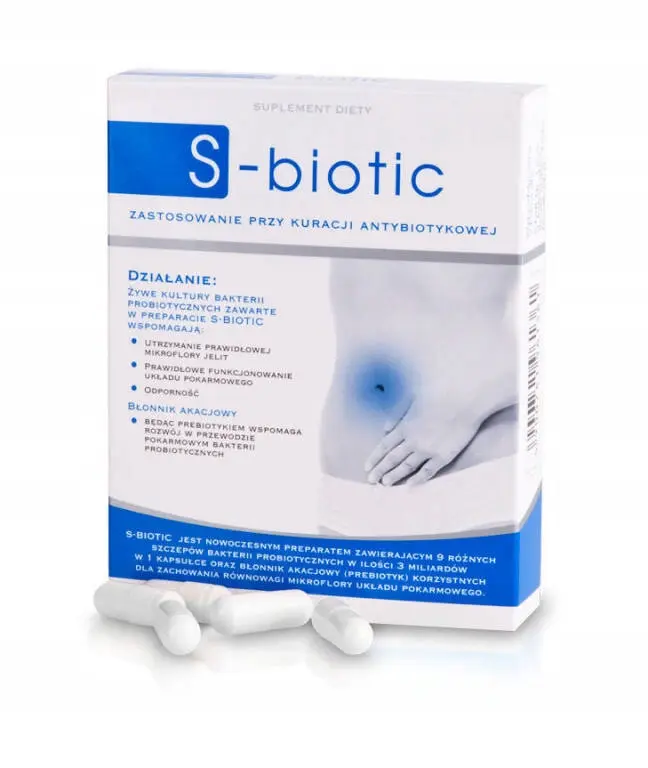 S-biotic jest nowoczesnym preparatem zawierającym 9 różnych szczepów bakterii probiotycznych (w tymLactobacillus rhamnosus, Lactobacillus plantarum, Lactobacillus acidophilus, Bifidobacterium animalis subsp. lactis, Bifidobacterium longum, Bifidobacterium breve), w ilości 3 mld w 1 kapsułce, korzystnych dla zachowania równowagi mikroflory układu pokarmowego oraz błonnik akacjowy (prebiotyk).