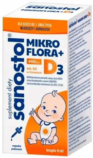 Sanostol Mikroflora + D3 jest to suplement diety w kroplach dla dzieci od 1. dnia życia, młodzieży i dorosłych. Zawiera on 400 j.m. wit. D w 5 kroplach (w formie cholekalcyferolu – witamina D3) oraz trzy różne szczepy bakteryjne: Bifidobacterium animalis subsp. lactis BS01, Limosilactobacillus reuteri LAB2PRO Lacticaseibacillus rhamnosus GG ATCC 53103. Łączy ze sobą dwa rodzaje składników: witaminę D i bakterie kwasu mlekowego, aby jak najlepiej wspomóc odporność, kości i mikroflorę dzieci. Krople 8 ml.