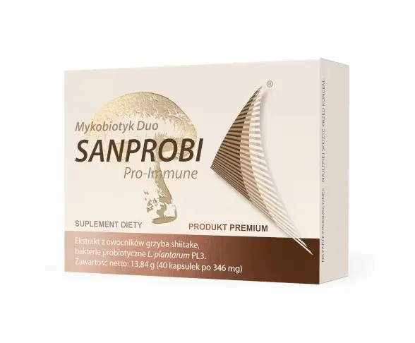 Sanprobi Pro-Immune to unikalne połączenie grzybów oraz probiotyku, które uzupełnia codzienną dietę o bakterie probiotyczne L. plantarum PL3 - składnik mikrobioty jelitowej oraz polisacharydy beta glukany grzyba shiitake.