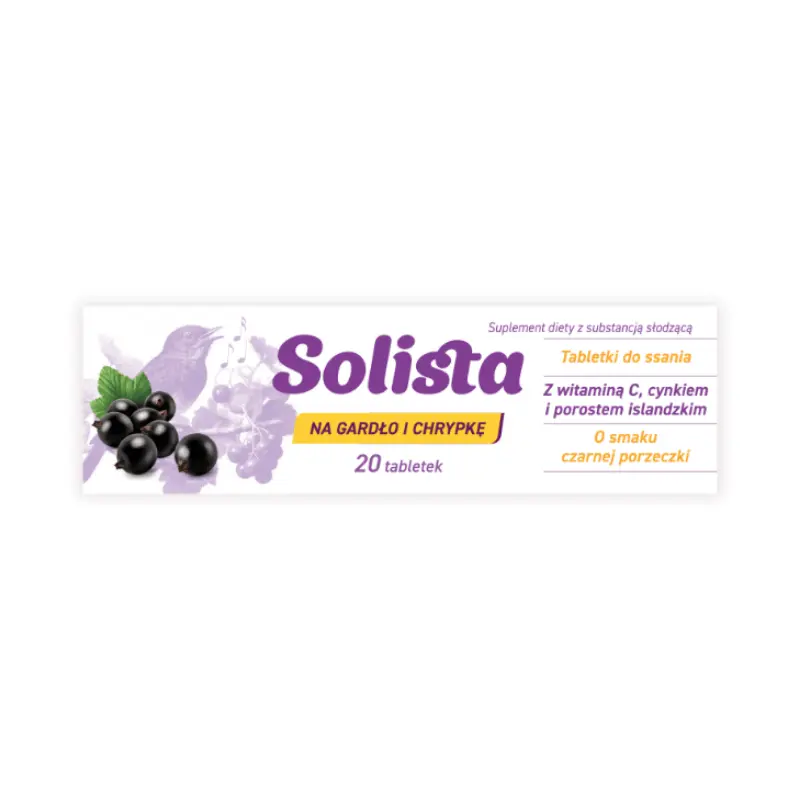 SOLISTA na gardło i chrypkę to suplement diety w postaci tabletek do ssania o smaku czarnej porzeczki zawierający witaminę C, cynk i porost islandzki. Produkt przeznaczony dla osób dorosłych i dzieci powyżej 4. roku życia. Nie zawiera cukru.