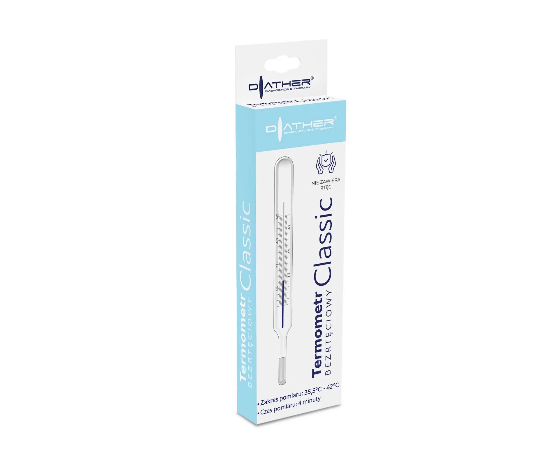 Termometr BEZRTĘCIOWY Classic znajduje się w szklanej obudowie wypełnionej cieczą metaliczną (stopem galu, indu i cyny). Szklana obudowa zapewnia wygodne użytkowanie i może być poddana czyszczeniu oraz dezynfekcji. Termometr umożliwia pomiar temperatury ciała na 3 sposoby: w ustach, pod pachą lub w odbycie, co sprawia, że jest praktyczny i łatwy w użyciu. Pacjenci mają możliwość wyboru najdogodniejszego dla siebie sposobu pomiaru temperatury ciała.