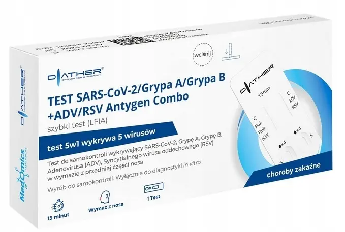 Właściwości: Test służy do wykrywania: SARS-CoV-2 (COVID-19) Wirus grypy typu A Wirus grypy typu B RSV, Adenowirus Produkt jest przeznaczony do szybkiego i jakościowego wykrywania pięciu kluczowych patogenów układu oddechowego: wirusa SARS-CoV-2, wirusa grypy Influenza typu A i B, adenowirusa oraz syncytialnego wirusa oddechowego (RSV) przy użyciu próbki wymazu z nosa. Test wykonywany jest na próbkach wymazów z nosa.
