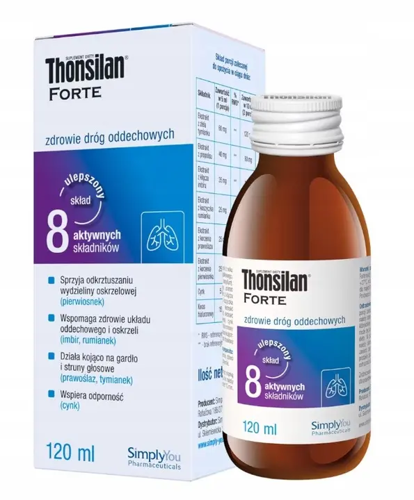 THONSILAN FORTE to suplement diety, który dzięki zawartym składnikom sprzyja odkrztuszaniu wydzieliny oskrzelowej (pierwiosnek), wspiera zdrowie układu oddechowego i oskrzeli (imbir, rumianek), działa kojąco na gardło i struny głosowe (prawoślaz, tymianek, pierwiosnek, rumianek), a także wspomaga prawidłowe funkcjonowanie układu odpornościowego (cynk). Thonsilan Forte to produkt o malinowym smaku z dodatkiem soku z aronii.