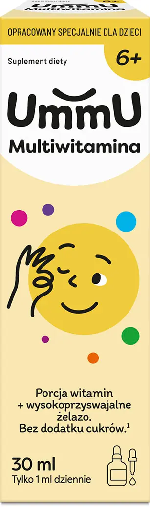 UmmU Multiwitamina 6+ - to suplement diety w postaci płynu, który zawiera witaminy z grupy B, witaminę D oraz żelazo. Produkt przeznaczony dla dzieci powyżej 6. roku życia. Bez dodatku cukrów. Zawiera substancje słodzące. Smak pomarańczowy.
