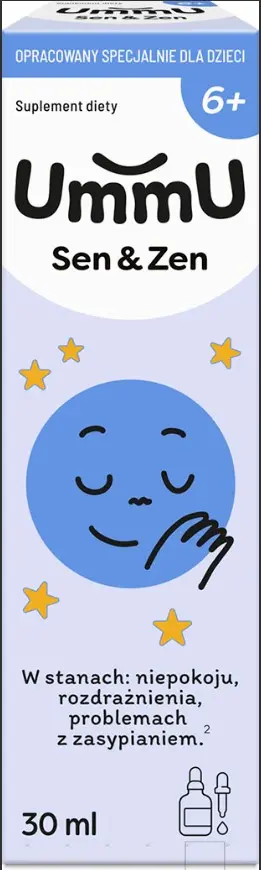 UmmU Sen & Zen 6+ - to suplement diety w postaci płynu o przyjemnym smaku, który zawiera witaminę B6 oraz ekstrakty z melisy i rumianku. Produkt przeznaczony dla dzieci powyżej 6. roku życia.