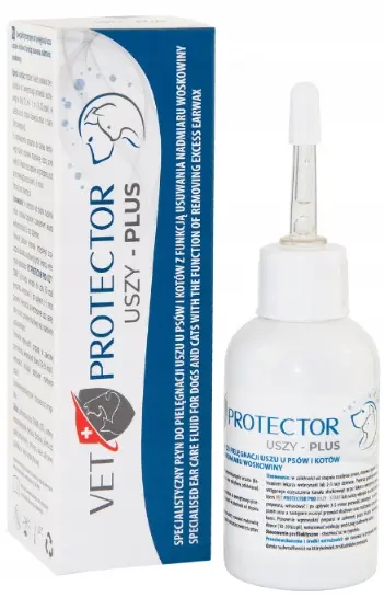 VET PROTECTOR USZY – PLUS – preparat do stosowania profilaktycznego oraz pielęgnacyjnego w stanach zapalnych zewnętrznego przewodu słuchowego. ✅Bakterie, grzyby i pasożyty (w wyniku zakażeń, obserwujemy postępujące zmiany patologiczne przewodu słuchowego zewnętrznego [zwężenia, rozrost gruczołów, obrzęk, pofałdowanie powierzchni, włóknienie, wapnienie, rozrosty patologiczne] oraz zapalenie ucha środkowego) ✅Alergia (odpchelna, atopowa, pokarmowa, odlekowa - charakterystycznymi objawami są zmiany rozrostowe skóry, skorupy, rumień czy wysięk) ✅Zaburzenia hormonalne (stan zapalny może być powodowany niedoczynnością tarczycy, poprzez limfocytarne zapalenie tego narządu) ✅Autoimmunologia (infekcje powodowane zaburzonym mechanizmem obronnym skóry ucha) ✅Uraz i inne (ciało obce/drażniące, włos, polipy, nowotwory) SPOSÓB UŻYCIA 1. Pierwsze podanie wymaga wstępnego oczyszczenia kanału słuchowego przez lekarza weterynarii produktem VET PROTECTOR PRO USZY - START lub należy wkroplić do ucha 20 kropli preparatu, wmasować i po upływie 3-5 minut pozwolić zwierzęciu na wytrzepanie ucha a następnie osuszyć. 2. Ponownie wprowadzić preparat w zaleconej przez lekarza weterynarii dawce (10-20 kropli), wmasować uciskając podstawę małżowiny usznej. 3. Stosowanie profilaktyczne - stosować raz w tygodniu.