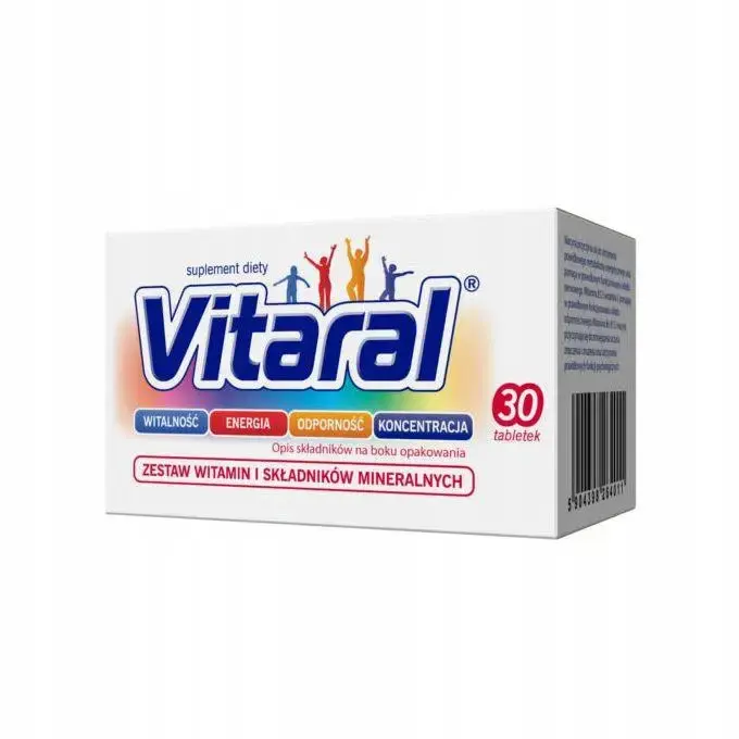 Vitaral to suplement diety zawierający optymalny zestaw 11 witamin i 8 składników mineralnych wzbogacony o rutynę. Zawarte w produkcie składniki pomagają zachować witalność, energię oraz wspierają utrzymanie prawidłowego poziomu odporności i koncentracji. Produkt zawiera m.in. witaminy C, D oraz cynk, które pomagają w prawidłowym funkcjonowaniu układu odpornościowego, magnez, żelazo i niacynę, które przyczyniają się do zmniejszenia uczucia zmęczenia i znużenia oraz witaminy z grupy B, które wpływają na wsparcie funkcji psychologicznych. Vitaral uzupełnia codzienną dietę w okresach zwiększonego zapotrzebowania na witaminy i minerały, np. podczas infekcji i osłabienia organizmu, w czasie wytężonego wysiłku fizycznego lub intelektualnego.
