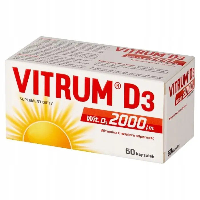 Wysoka dawka witaminy D3 w wygodnej formie kapsułek. 60 sztuk = aż 2 miesiące suplementacji! Vitrum D3 2000 IU to wysokiej jakości suplement diety zawierający cholekalcyferol (witamina D3), który odgrywa kluczową rolę w zachowaniu zdrowych kości, zębów i odporności. Wygodna forma kapsułek i duże opakowanie to idealne rozwiązanie dla osób ceniących skuteczność, prostotę i ekonomię stosowania.
