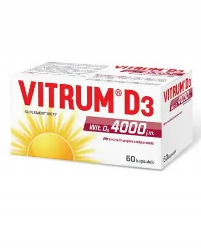Vitrum® D3 4000 to suplement diety w kapsułkach opracowany z myślą o uzupełnieniu diety osób dorosłych powyżej 75 roku życia. Każda kapsułka zawiera 4000 j.m. witaminy D w formie cholekalcyferolu i stanowi dzienną zalecaną porcję. Opakowanie zawiera 60 łatwych do połknięcia miękkich kapsułek i pozwala na 2-miesięczną suplementację dla jednej osoby zgodnie z zaleceniami.