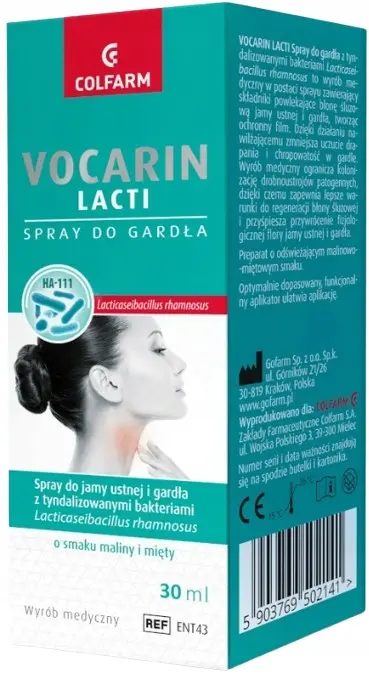 Vocarin Lacti Spray do gardła to wyrób medyczny w postaci sprayu, zawierający tyndalizowane (niezdolne do życia) bakterie kwasu mlekowego Lacticaseibacillus rhamnosus, który powleka błonę śluzową jamy ustnej i gardła tworząc ochronny film.