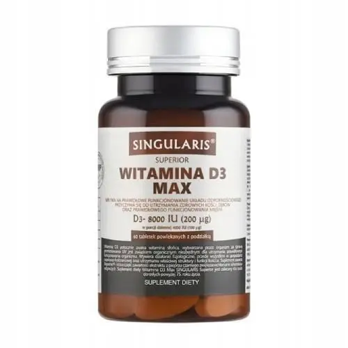 Suplement zawiera Bioperine, która dzięki zawartości ekstraktu z pieprzu czarnego zwiększa wchłanianie składników odżywczych. Suplement diety Witamina D3 Max Singularis Superior jest zalecany dla osób dorosłych powyżej 75. roku życia.