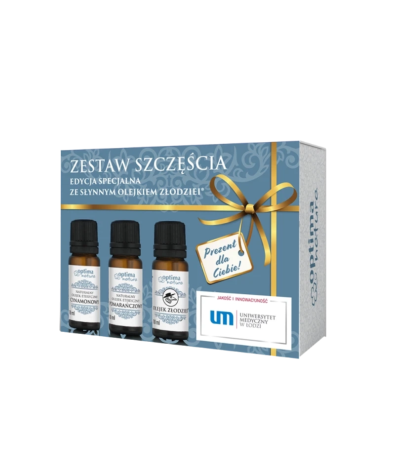Zestaw szczęścia zawiera trzy 100% naturalne olejki eteryczne 10 ml Optima Natura w upominkowym pudełeczku idealne do aromaterapii.