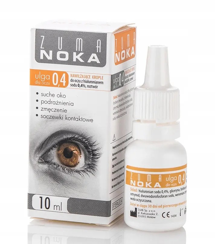 Krople Zuma Noka 0,4% Ulga dla oczu są stosowane w przypadku suchości, podrażnień i zmęczenia oczu oraz noszenia soczewek kontaktowych. Przynoszą ulgę i nawilżają oczy.