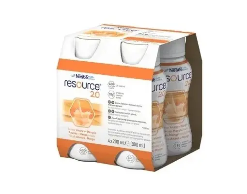 Resource 2.0 smak ananas–mango 4 × 200 ml – kompletna dieta wysokoenergetyczna (żywność specjalnego przeznaczenia medycznego) Żywność specjalnego przeznaczenia medycznego do postępowania dietetycznego w niedożywieniu lub ryzyku jego wystąpienia, również w chorobach przewlekłych oraz w sytuacjach, gdy występują trudności z żuciem lub połykaniem. Resource 2.0 dostarcza pełnowartościowego białka, tłuszczów i węglowodanów oraz zestawu witamin i składników mineralnych. Może być stosowany jako wsparcie żywieniowe lub jako jedyne źródło pożywienia – wyłącznie pod kontrolą lekarza. Produkt jest sterylizowany UHT, bezglutenowy i pakowany w atmosferze ochronnej.