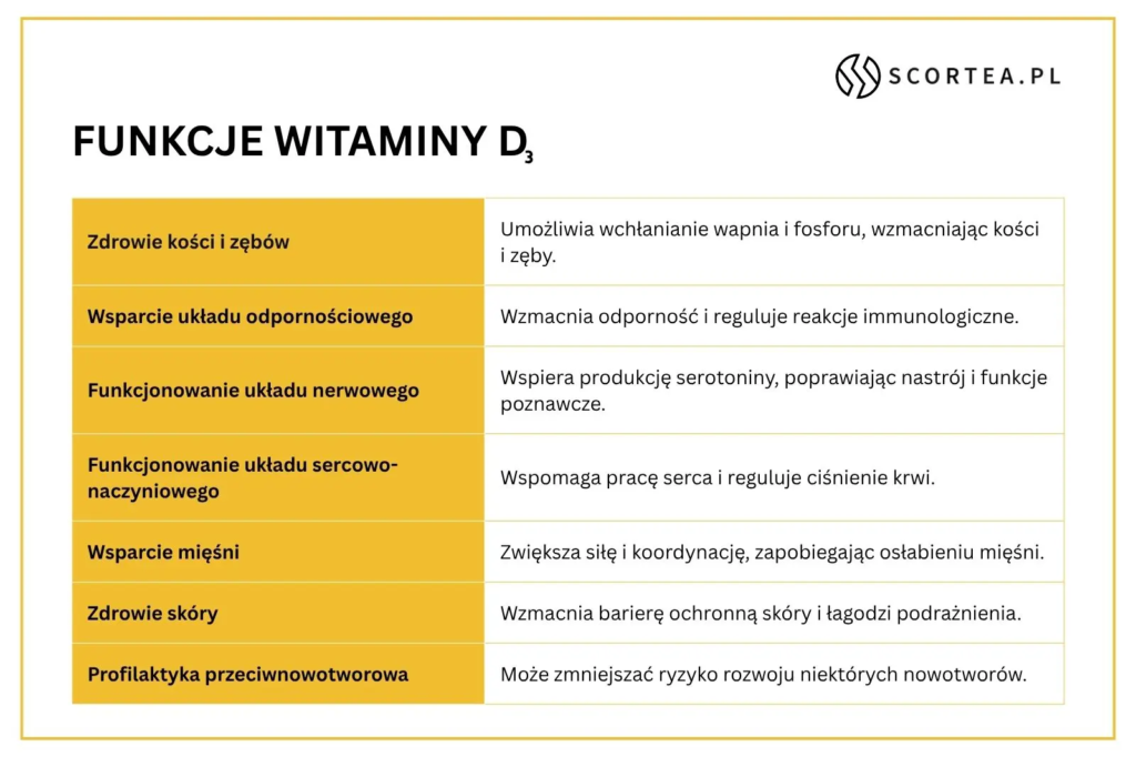 Jej głównym zadaniem jest regulacja gospodarki wapniowo-fosforanowej, co przekłada się na mocne i zdrowe kości. W porównaniu do witaminy D2, D3 skuteczniej aktywuje szlaki interferonu typu I (mechanizmy obronne komórek), dzięki czemu lepiej wspiera układ odpornościowy i zwiększa odporność na infekcje wirusowe oraz bakteryjne.