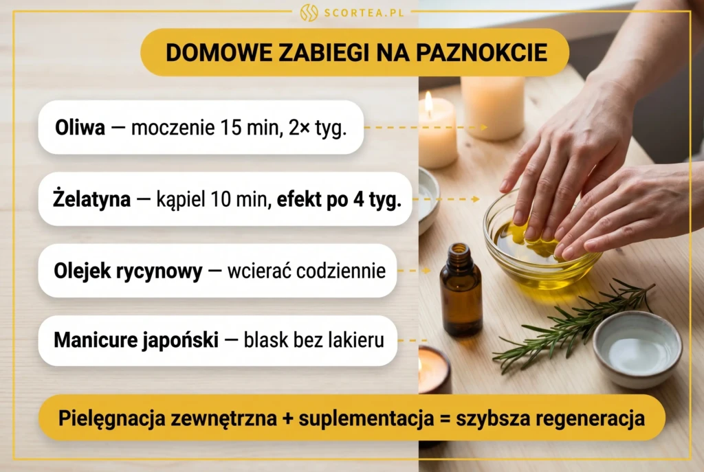 Kąpiel w żelatynie skutecznie dostarcza aminokwasów siarkowych do struktur rogowych. Zabieg trwa 10-15 minut i warto go powtarzać dwa razy w tygodniu, aby wzmocnić wiązania wewnątrz płytki. Utrzymuj temperaturę roztworu poniżej 40°C, by zachować właściwości kolagenu. Dzięki temu paznokcie stają się twardsze już po 4 tygodniach regularnego stosowania.